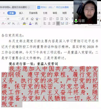 活动第二阶段为支部主题党日活动。由于科级干部调整,原来机关党支部组织委员王宁调出beats365官方网站,重新推举郭霖同志为组织委员。各位党员自觉交纳了4月党费,并在马书记带领下,全体党员利用屏幕共享和手机语音重温了入党誓词,这也是疫情防控工作中一次特别的党员宣誓。紧接着,大家集中学习重要会议文件精神:3月4日中共中央政治局常务委员会会议精神、3月6日决战决胜脱贫攻坚座谈会精神、习近平在湖北省考察新冠肺炎疫情防控工作时的讲话精神、3月18日中共中央政治局常务委员会会议精神、3月27日中共中央政治局会议精神和公司2020年工作会议精神。随后,马书记传达了公司4月份中心组学习及党委扩大会议精神,主要通报了2020年公司的重点工作,对近期的重点工作进行提醒。活动最后,大家还围绕“结合疫情防控谈共产党员如何在公司双一流建设中发挥作用”开展研讨。每位机关人员都结合自己的实际从疫情防控、日常工作、学科和公司发展3个方面进行讨论,并达成一致工作态度:保安全、抓落实、谋发展。