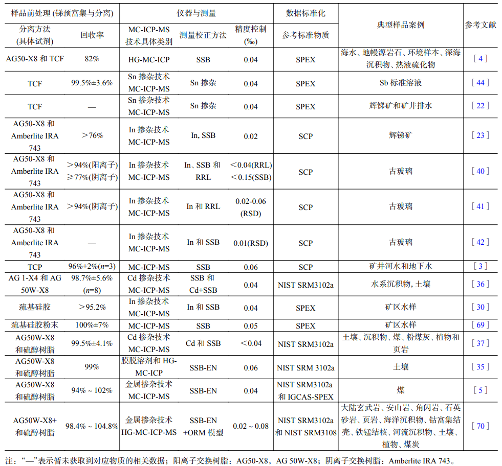 通过对锑同位素的系统梳理,论文旨在为理解锑的全球循环机制、制定污染治理策略及开展矿产资源勘查提供新的视角与启示。研究指出,锑同位素在氧化还原、吸附、生物作用及蒸发过程中的分馏,受氧化态、键合环境及动力学过程等因素控制,自然界中多过程的耦合为解析其迁移转化提供了理论依据。在样品分析中,简单基质优选巯基棉纤维法(TCF);复杂基质需高回收率时宜用离子交换色谱法;中等浓度及特定基质样品可选用TCP法或巯基硅胶法,上述方法可灵活联用,以平衡回收率、精度与效率。