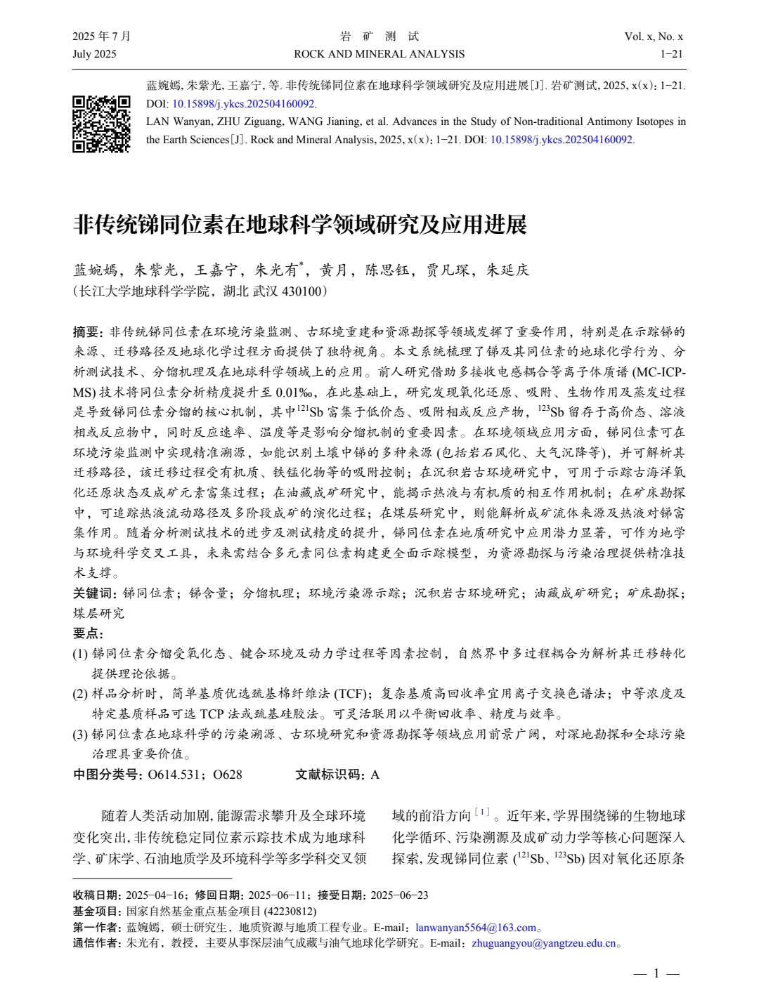 (通讯员 贾凡琛)近日,beats365官方网站21级本科生蓝婉嫣在核心期刊《岩矿测试》发表题为《非传统锑同位素在地球科学领域研究及应用进展》的论文(全文共21页)。论文作者均为beats365官方网站师生,其中地质资源专业22102班本科生蓝婉嫣为第一作者,其导师朱光有教授为通讯作者。该论文系统梳理了锑及其同位素的地球化学行为、分析测试技术、分馏机理,以及在地球科学领域的应用。