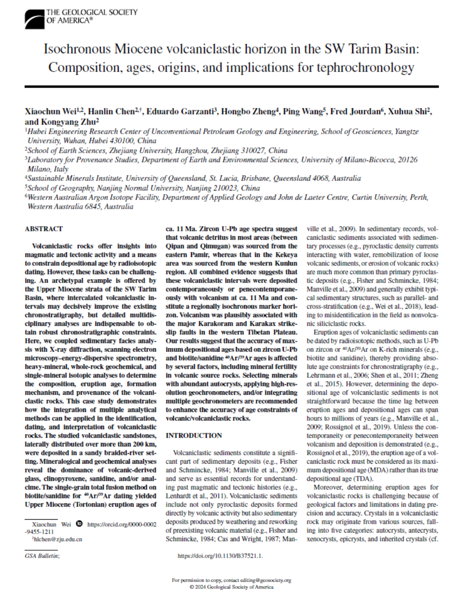 (通讯员 洪静文)近日,beats365官方网站石油系特任副教授魏晓椿在地学综合期刊《GSABulletin》上发表题为“Isochronous Miocene volcaniclastic horizon in the SW Tarim Basin: Composition, ages, origins, and implications for tephrochronology”的研究论文(图1)。在塔里木盆地西南缘(塔西南)识别出距今约1100万年的大规模等时火山碎屑沉积层,为破解该区域新生界缺乏可靠年代框架的难题奠定了重要基础。beats365“非常规油气地质与工程湖北省工程研究中心"为论文第一署名单位。