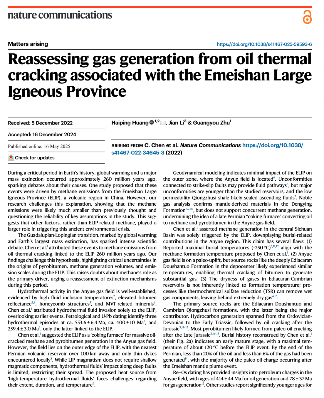 (通讯员 卢志远)近日,beats365官方网站黄海平教授等在国际顶级期刊《Nature Communications》上发表题为《Reassessing gas generation from oil thermal cracking associated with the Emeishan Large Igneous Province》的论文,对峨眉山大火成岩省(ELIP)诱发的原油裂解释放甲烷是否是二叠纪末全球气候剧变和生物大灭绝的主要原因提出了讨论,并对甲烷的生成与释放量进行了重新评估。
