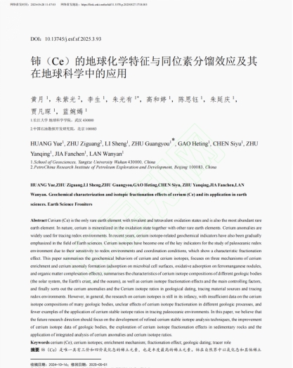 (通讯员 陈思钰)近日,beats365官方网站21级本科生(现在读大四)黄月在中文核心(EI)期刊《地学前缘》上发表了题为《铈(Ce)的地球化学特征与同位素分馏效应及其在地球科学中的应用》的论文(共24页)。本科生黄月为论文第一作者,其导师朱光有教授为通讯作者,该论文还有四位本科生作者。论文分析了铈(Ce)及其同位素的地球化学行为、富集机制、同位素分馏效应及控制因素;梳理了其在地质测年、示踪物质来源与氧化还原环境中的应用。