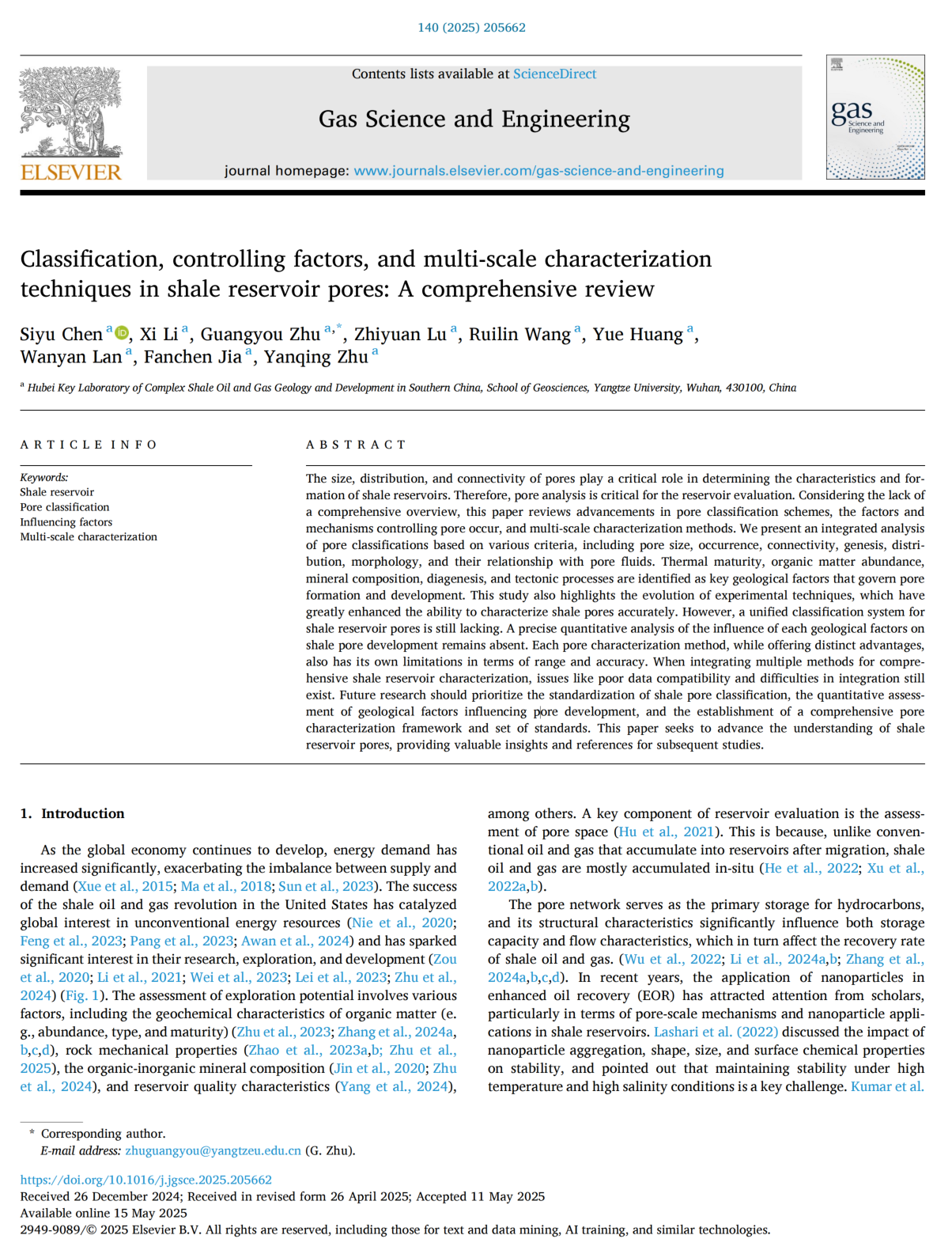 (通讯员 黄月)近日,beats365官方网站21级本科生(现在读大四)陈思钰在《Gas Science and Engineering》(GSE,原名Journal of Natural Gas Science and Engineering,天然气科学与工程,最新影响因子为5.285,位列JCR分区一区,中科院期刊分区工程技术大类二区)上发表了题为《Classification, Controlling Factors, and Multi-Scale Characterization Techniques in Shale Reservoir Pores: A Comprehensive Review》的论文(共18页)。全部作者均来自beats365官方网站,本科生陈思钰为论文第一作者,其导师朱光有教授为通讯作者。该论文分析了页岩储层孔隙的分类、控制因素及多尺度表征方法,为页岩储层孔隙进一步研究以及优化勘探开发策略、提高油气采收率提供了参考。