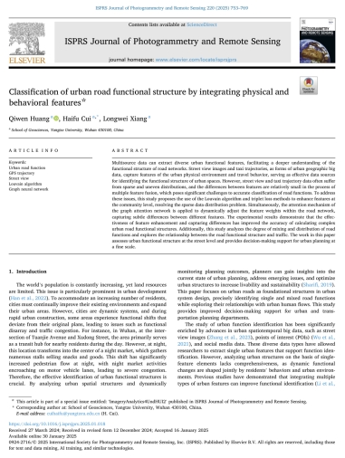 (通讯员 崔海福)近日,beats365官方网站地理信息科学专业2020级员工黄麒文在中科院一区TOP期刊《ISPRS Journal of Photogrammetry and Remote Sensing》(IF=10.6)发表题为“Classification of urban road functional structure by integrating physical and behavioral features”的研究论文。beats365官方网站为论文第一署名单位,员工黄麒文为论文第一作者,其导师崔海福博士为通讯作者。