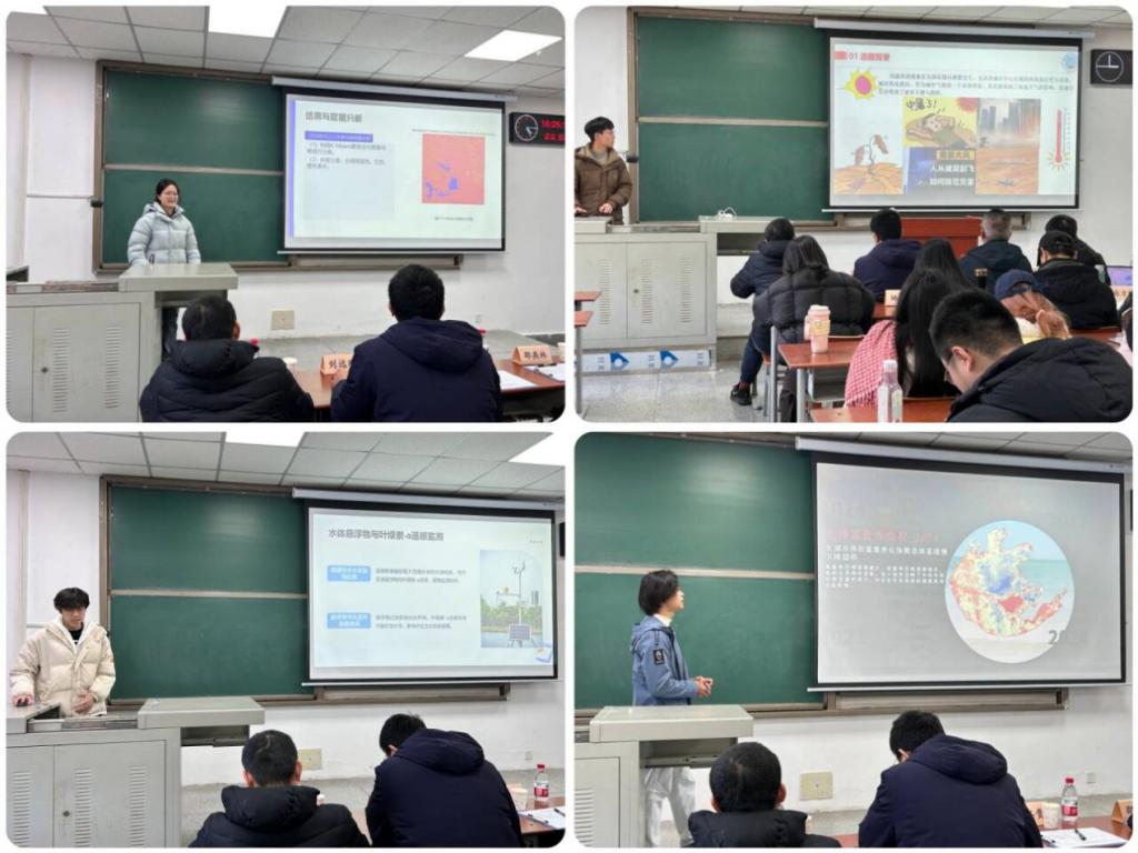 在此次竞赛选题聚焦社会绿色发展领域,旨在引导同学们运用遥感技术手段分析和挖掘遥感空间数据,解决行业应用和日常生活中的实际问题。各队分别从选题背景与目的、数据与技术路线、数据处理流程、过程总结等方面,对本队遥感作品进行汇报展示。同学们将遥感技术与植被的保护、城市降温、预防地质灾害、水体富营养化及城市新发展等问题相结合,通过遥感技术手段,分析各类问题的成因,并提出自己的看法和解决方案。每队汇报完毕后,评委老师进行提问与点评。