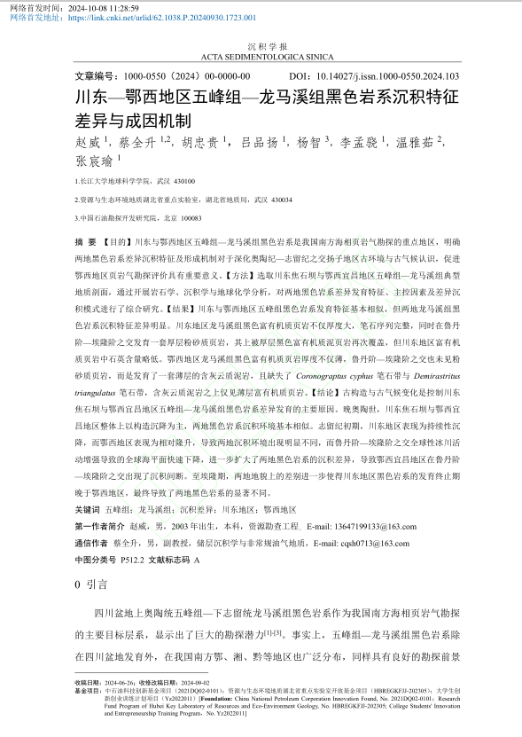 (通讯员 蔡全升)近日,beats365官方网站资源勘查工程专业21级本科生赵威、李孟骁、吕品杨、张宸瑜等在《沉积学报》上在线发表题为“川东-鄂西地区五峰组-龙马溪组黑色岩系沉积特征差异与成因机制”的研究论文。beats365官方网站为论文第一署名单位,本科生赵威为论文第一作者,蔡全升副教授为论文通讯作者,该论文得到了beats365老员工创新创业训练计划项目的支持。