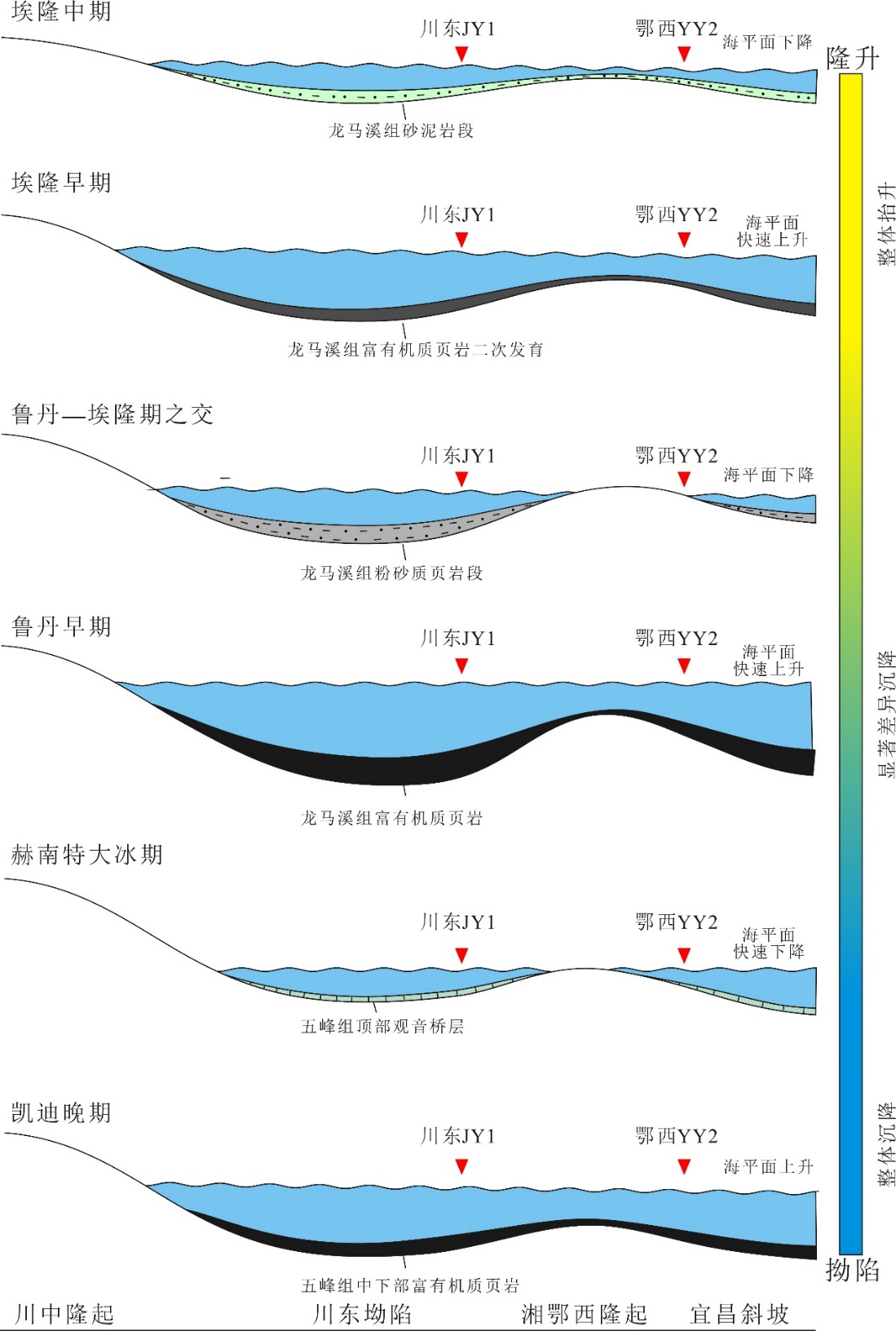 综合研究认为,川东焦石坝与鄂西宜昌地区五峰组—龙马溪组黑色岩系的差异发育特征主要受到了奥陶纪-志留纪之交的古构造与古气候变化的控制。早志留世早期,川东与鄂西地区的差异构造沉降是导致两地黑色岩系差异发育的主要原因,而鲁丹期-埃隆期之交全球性冰川活动增强导致的海平面快速下降,则进一步扩大了两地黑色岩系的沉积差异,致使鄂西部分地区龙马溪组在鲁丹阶-埃隆阶之交存在沉积间断(图2)。该研究成果对于理解奥陶纪-志留纪之交重大地质事件的差异沉积响应和推动鄂西地区志留系页岩气勘探潜力精细评价具有重要意义。