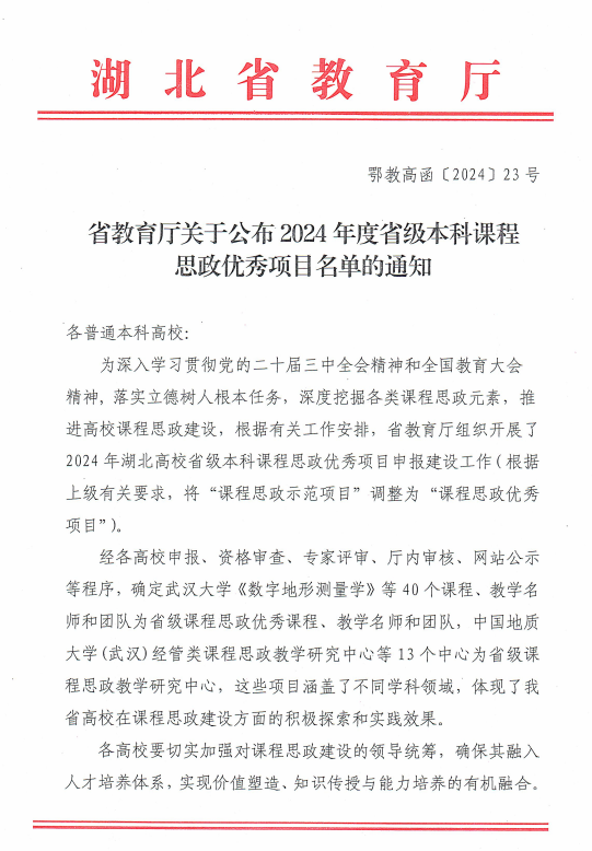 近日,湖北省教育厅公布了2024年度省级本科课程思政优秀项目名单,全省共评选出40项普通本科教育类课程思政优秀项目,公司《油气地质野外实习》课程首次获批“省级课程思政优秀课程”,课程团队荣获“省级课程思政教学名师(团队)”,这也是迄今为止公司获批的5门省级课程思政优秀项目中唯一一门实践类课程。