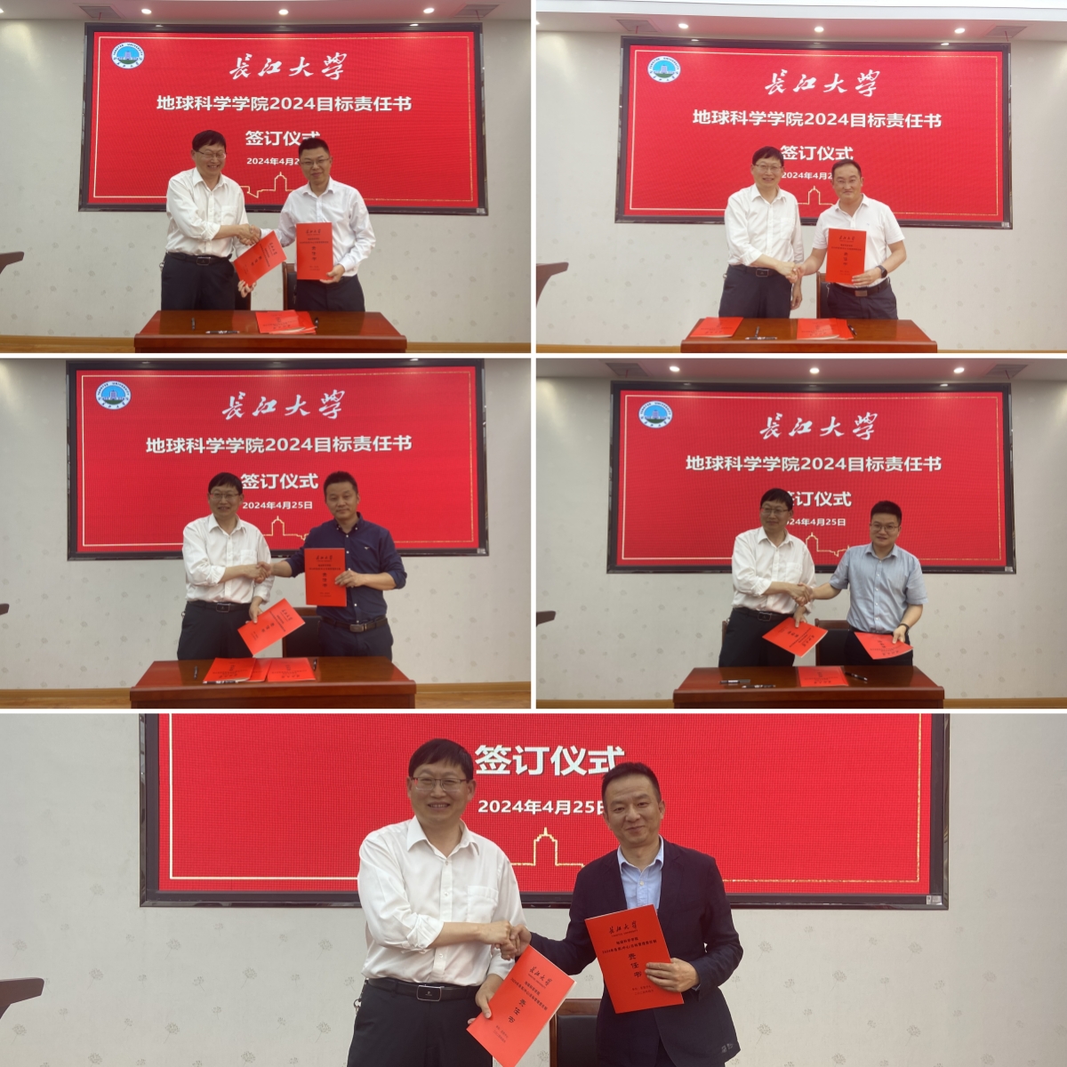 为增强全院教师发展的使命感,明晰职责和任务,公司举行了2024年各系(中心)目标管理责任书签订仪式,石油系主任饶松,地质系主任李涛,地信系主任刘远刚,地科系主任刘彬,实验中心主任丰勇依次上台与朱光有经理签订2024年各系目标管理责任书,签下一份责任,签下一份承诺。