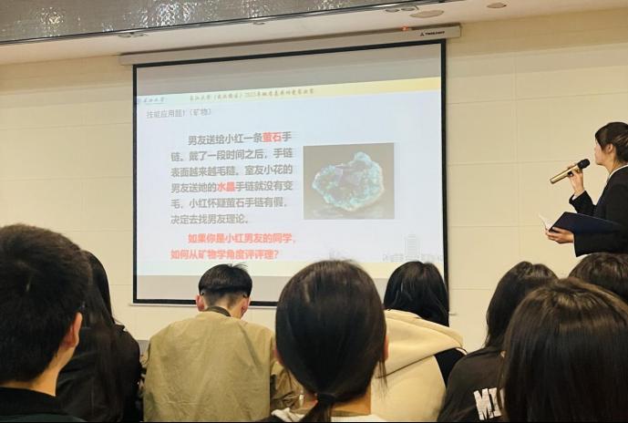 第二个环节“技能应用题”主要考察选手的专业知识应用能力。题目由老师们精心设计,将专业知识与时事生活紧密相关,如“萤石手链是否会变毛糙”,“英国皇冠上著名的‘黑王子红宝石’却被检验为红色尖晶石,如果你是珠宝鉴定师,该如何鉴定?”等题目,既增加了比赛的趣味性,又引导同学们将专业知识运用到日常生活领域,提升专业学习兴趣。答题完毕后,评委老师对每题都进行了详细点评,全场同学认真聆听。