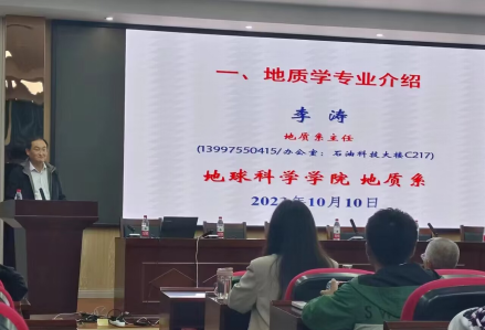 会议首先进行了地质学专业介绍。李涛主任从地质学专业一流的员工、一流的团队、一流的平台、一流的出路、造就一流的专业谈起,从每届地质学专业同学的勤奋学习,踏踏实实,创造了良好学风,取得了丰硕的学习成就,到地质学专业创立以来深厚的积累等,亲切、风趣地讲述了可以“上天、入地、下海”的地质学发展前景,激励同学们在未来努力学习奔赴美好未来。