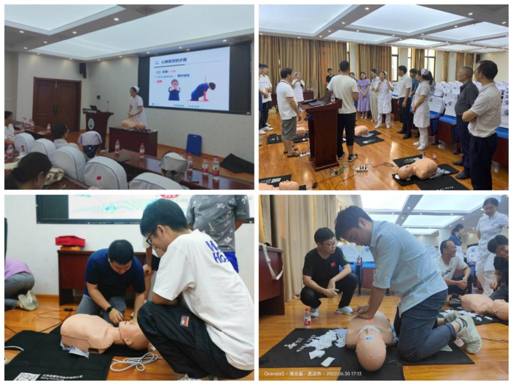 会后,结合公司党员干部下基层察民情解民忧暖民心实践活动方案,公司邀请了医学部4位老师为公司师生进行“医心向党,健康长大”急救技能培训。医学部行政副部长王真代表医学部表示,医学部将利用专业知识无偿为公司师生服务。随后,邓文芳老师结合实例系统地讲解了心肺复苏的使用背景以及抢救流程,并利用模拟人,给在座师生做了标准的现场示范。最后,医学部护理系龚爱萍、邓文芳、齐桂老师组织公司师生进行分组实操练习和现场考核。此次培训现场座无虚席,师生参与热情高,大家纷纷表示获益良多,且充分意识到掌握急救技能的重要性和医护人员的不易。