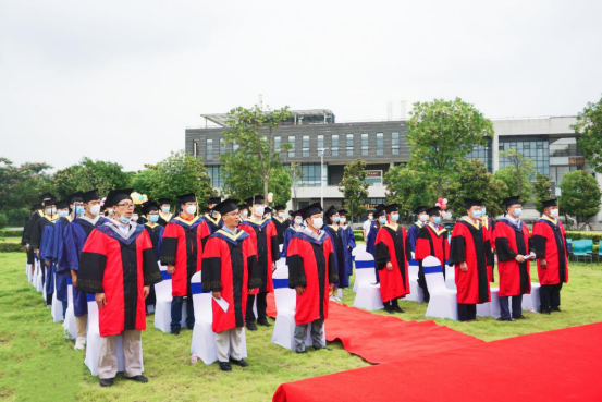 在雄壮的国歌声中,毕业典礼正式拉开帷幕。虽然戴着口罩,但师生们的歌声依旧嘹亮、富有激情,为这一刻的到来,大家已等待了太久。宣读文件、授予学位、经理胡明毅教授为到场的毕业生一一拨穗正冠,并合影留念。
