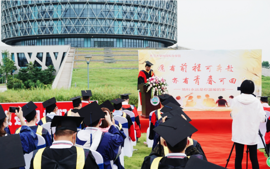 作为优秀毕业生代表,矿物QZ171班的归航在发言中首先致敬为疫情防控冲锋在前的英雄,紧接着还谈到“有机会和同学当面说一声‘毕业快乐’,内心很感恩。期待与各位知音湖畔再相会!”。