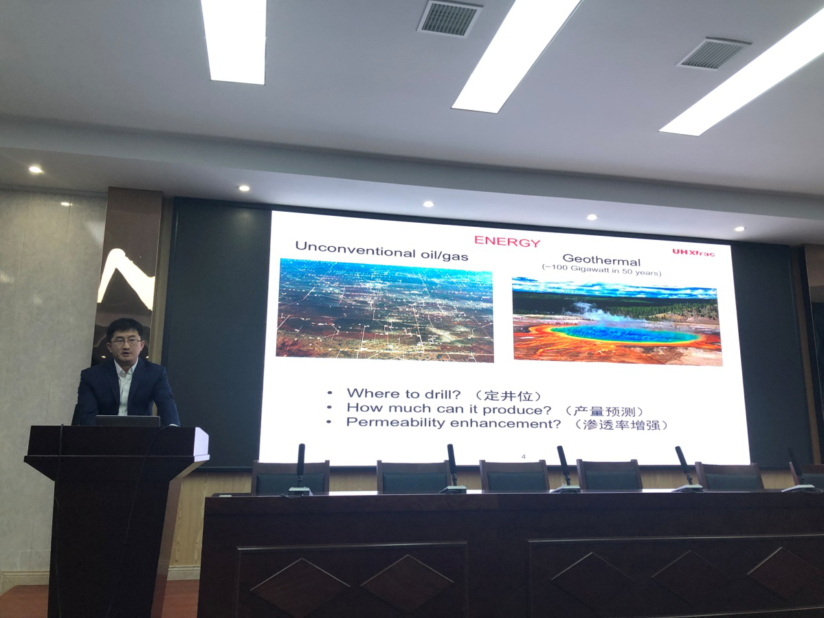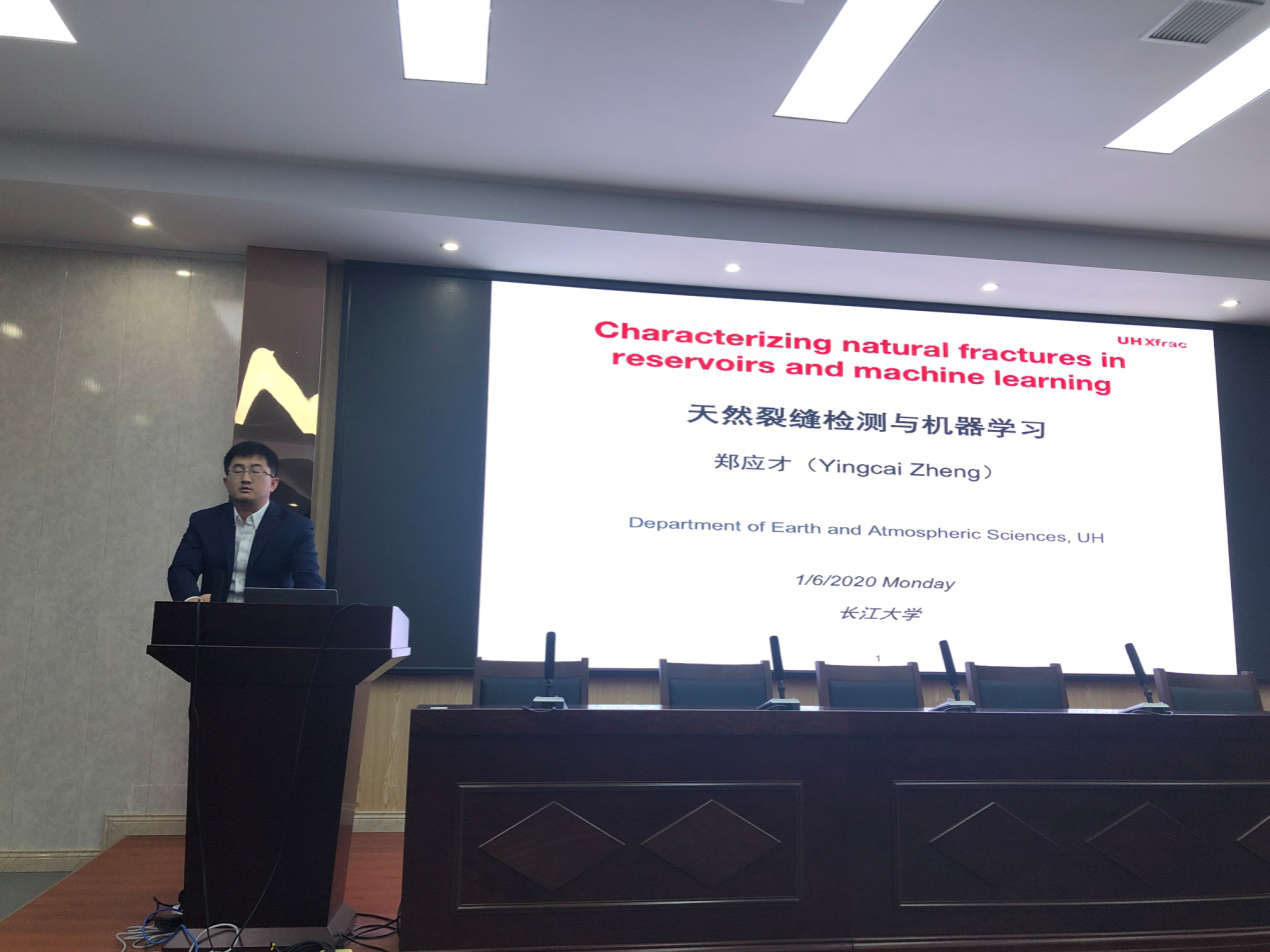郑教授以全英文的标题 “Characterizing natural fractures in reservoirs and machine learning”引入讲座,从天然裂缝的检测和机器学习方法两个方面进行了讲述。从波段如何衍射、井位如何选取、产量如何预测等方面应用机器学习的方法展开了详细的论述。郑教授全英文的讲座既增加了员工学习专业英语的热情,又丰富了员工的国际视野。郑教授丰富的经历也给师生提供了更多的学术资源。