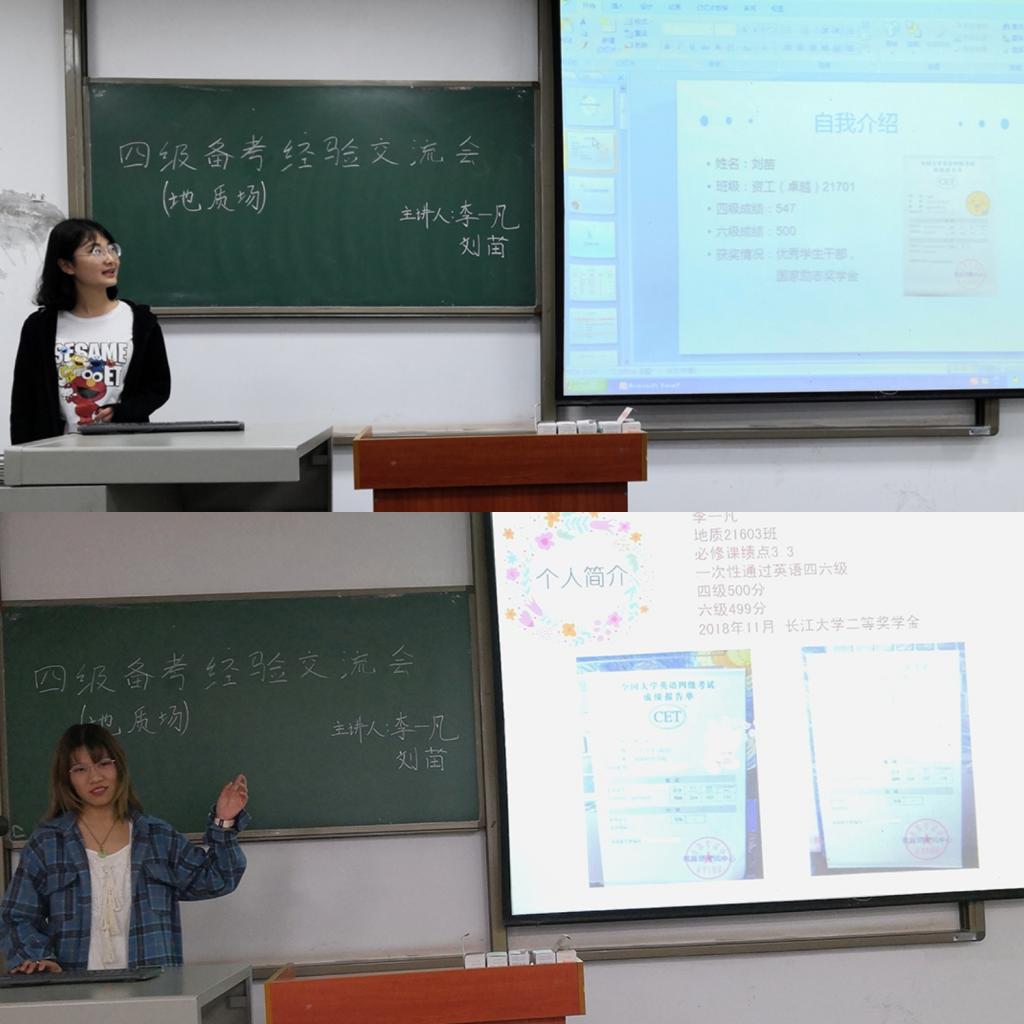 (通讯员杨俊)为了增强同学们对英语四级考试的了解,更好的迎接即将到来的四级考试。4月27日晚7点,公司全体大一同学分别在A107、A108和A109教室分专业举行了英语四级备考经验交流会。主讲人分别是资工专业的陈芷若、王明敏,地质专业的李一凡、刘苗以及地信专业的杨添翔、罗慈航等人。