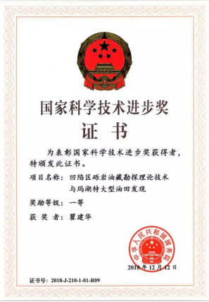 2019年1月8日,2018年度国家科学技术奖在京揭晓,共评出285个项目(人选)。其中,国家自然科学奖38项,国家技术发明奖67项,国家科学技术进步奖173项。公司员工瞿建华在国家科学技术进步奖一等奖的评选中,以“凹陷区砾岩油藏勘探理论技术与玛湖特大型油田发现”项目荣获一等奖。此项目中,瞿建华参加制定玛湖凹陷三叠系百口泉组整体部署方案,负责高密度地震解释配套技术攻关,为玛湖凹陷井位部署和储量上交发挥了重要支撑作用。