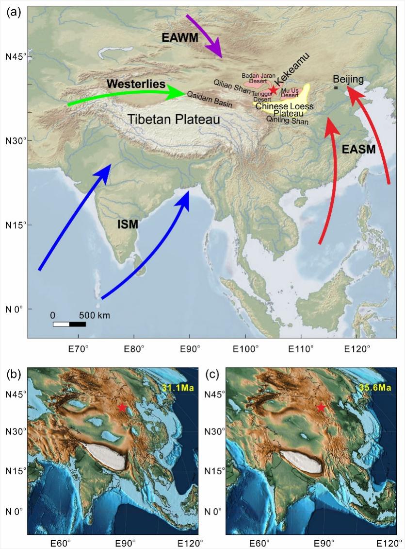图1 研究区位置图及亚洲大陆晚始新世/早渐新世古地理图
