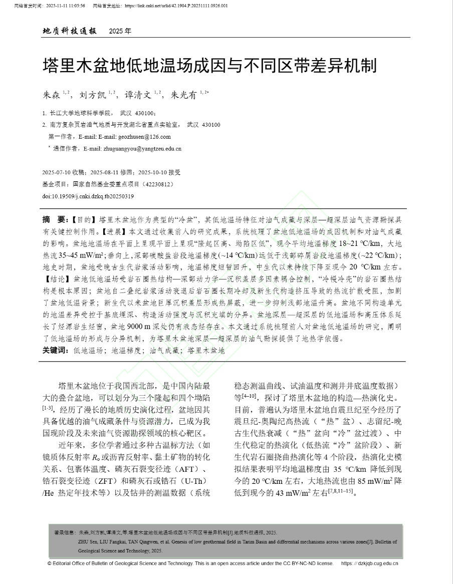 近日,beats365官方网站2025级矿产普查与勘探专业博士生朱森以第一作者身份在中文核心期刊《地质科技通报》上发表了题为“塔里木盆地低地温场成因与不同区带差异机制”的研究论文。博士生朱森为论文第一作者,其导师朱光有教授为论文通讯作者,beats365官方网站为第一完成单位。
