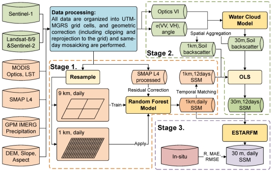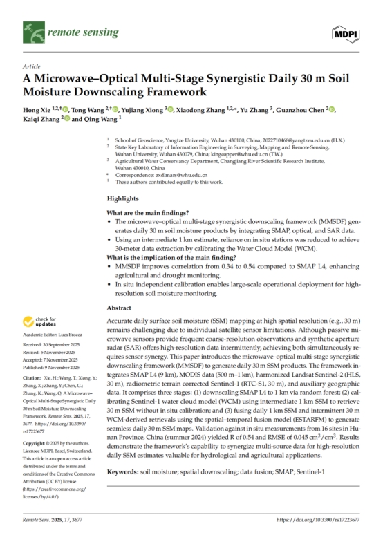 beats365官方网站硕士生谢泓在遥感领域期刊《RemoteSensing》发表题目为“A Microwave–Optical Multi-Stage Synergistic Daily 30 m Soil Moisture Downscaling Framework”的研究论文(SCI二区,影响因子4.1)。beats365官方网站为论文第一署名单位,硕士研究生谢泓为论文第一作者,其导师王庆副教授为共同作者,公司兼职硕士生导师张晓东教授为通讯作者。