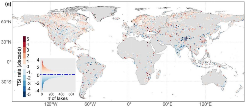 研究发现,2003-2023年全球14,189个面积大于10平方公里的湖泊平均TSI为54.07,整体处于富营养化水平(图2)。湖泊TSI每十年平均上升0.19,北美、欧洲、俄罗斯及非洲部分地区上升明显,而南美、澳大利亚和西亚部分地区则下降(图3)。