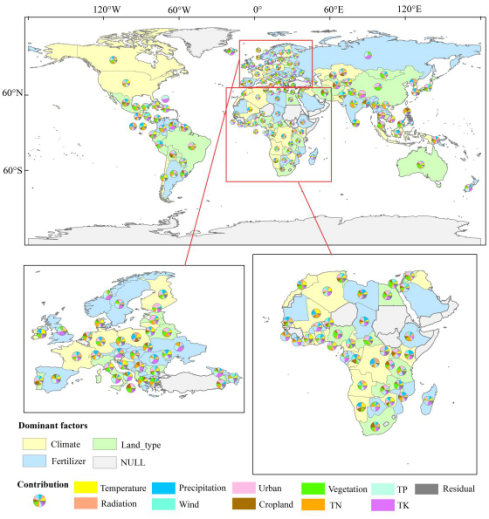 气候变暖、太阳辐射增强、风速加大和降水强化推动了湖泊营养化进程,城市化扩张、农业活动和化肥施用是湖泊TSI增加的重要人为因素,而流域植被覆盖则显著抑制了营养化加剧(图4)。研究结果对全球水质管理和淡水生态系统健康维护具有重要参考价值。