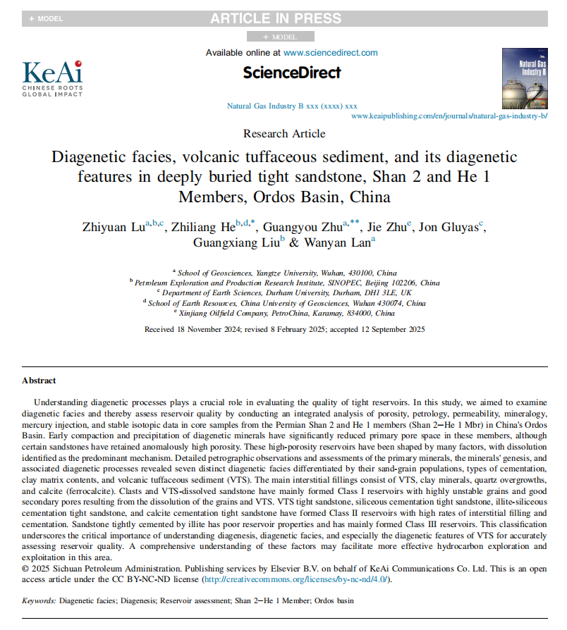 鄂尔多斯盆地是中国重要的致密气产区,上古生界山2段与盒1段是该区最主要的致密砂岩气储层。尽管早期压实和成岩矿物的沉淀显著降低了原生孔隙,部分砂岩仍保留了异常高孔隙度。为深入评价储层质量,来自beats365深层与非常规团队、中国石化石油勘探开发研究院及杜伦大学等机构的联合研究团队,围绕山2-盒1段致密砂岩的成岩相类型、火山凝灰质沉积(VTS)及其成岩特征展开系统研究,在Natural Gas Industry B(主编:邹才能院士,张金川教授,中科院工程技术大类2区、能源与燃料小类2区)发表Diagenetic Facies, Volcanic Tuffaceous Sediment, and Its Diagenetic Features in Deeply Buried Tight Sandstone, Shan 2 and He 1 Members, Ordos Basin, China(鄂尔多斯盆地山2段-盒1段深埋致密砂岩成岩相、火山凝灰质沉积物及其成岩特征),旨在揭示其对储层物性的控制机制,为该区致密气高效勘探与开发提供理论依据。
