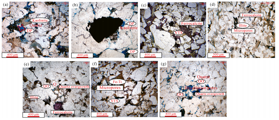 3.此外,通过流体包裹体均一温度测定和碳氧同位素分析,研究恢复了成岩流体演化历史。石英次生加大中的流体包裹体均一温度显示其形成于105–135°C的两个阶段,而碳酸盐胶结物的δ13C值较低(-20.2‰至-10.52‰),表明其碳源主要与有机质脱羧作用有关。这为酸性流体的来源及其触发的溶蚀作用提供了地球化学证据,解释了研究区优质储层形成的机理。