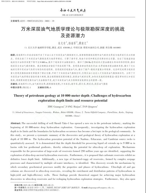 近期,beats365官方网站朱光有教授应邀在《石油与天然气地质》杂志上撰写“万米深层油气地质学理论与极限勘探深度的挑战及资源潜力”文章(共19页),系统总结了万米深层油气勘探发现与地质学理论。(1)刻画了南华系、埃迪卡拉系和寒武系烃源岩的空间展布规律,计算出关键地质历史时期的生气强度和生烃量,奠定了超深层油气勘探的资源基础,为开辟万米深层勘探空间和预测万亿立方米大气田分布区打下了基础。(2)论证了低地温场盆地液态石油保存深度下限可达9000 m,突破了石油勘探深度下限6000 m的传统认识,提升了超深层石油勘探潜力,并被近期超深井钻探证实。(3)揭示了2.5亿年前形成的大型油藏超长寿命的保存机制,修订了油气藏保存极限寿命的界定,推动超深层油气勘探重大发现与战略突破。(4)超深层碳酸盐岩储层非均质性极强,古老碳酸盐岩储层不存在深度下限。(5)发现复杂渗流形成的多油水界面缝洞型油藏新类型,提出横纵向无统一边界的大面积层状缝洞型油藏断珠体概念,丰富了油气藏类型,突破了传统背斜高点找油理论。(6)建立了原油裂解程度和油气相态的快速判识图版,揭示了次生地球化学作用对油气性质与相态的改造机制。(7)发现超深层超高油气柱,油柱高度近千米的油藏,揭示了高产高效井富集分布规律,打破油气勘探黄金带理论,揭示了万米深层超高油气柱形成与富油气区分布机制。这些研究成果为超深层重大发现及勘探战略变革提供了理论支撑,开辟了万米深层油气勘探空间。