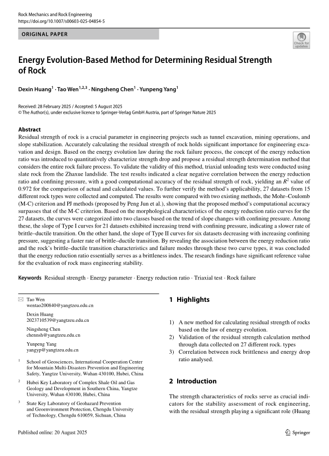 近日,beats365官方网站2023级研究生黄德昕在期刊《Rock Mechanics and Rock Engineering》(最新影响因子为6.6,位列JCR分区一区,中科院大类一区)上发表论文“Energy Evolution-Based Method for Determining Residual Strength of Rock”。beats365官方网站为论文第一署名单位,硕士研究生黄德昕为论文第一作者,其导师温韬教授为通讯作者。