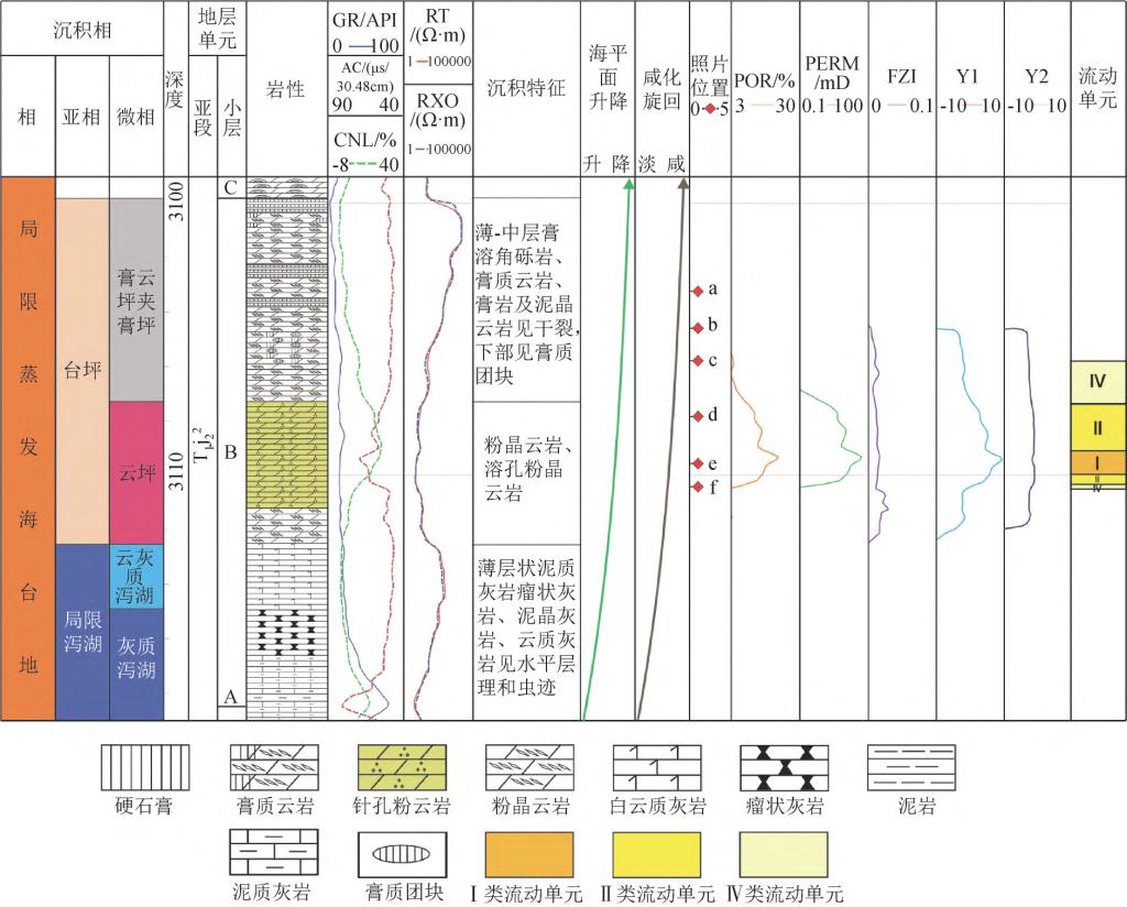 研究结果表明,Ⅰ类流动单元:针孔状粉晶云岩溶蚀+晶间孔隙具有低的排驱压力、较大的最大孔喉连通半径—大孔喉多、中值压力低、中值半径大—孔隙结构好,高孔高渗储层;Ⅱ类流动单元:针孔粉晶云岩/粉晶云岩以溶蚀孔+晶间孔隙为主,具有相对较低的排驱压力,和较小的最大连通孔喉半径—大孔喉少,中值压力较大,中值半径较小—孔隙结构相对较差,Ⅱ类流动单元虽然孔隙度较高,但储集空间的连通性较差;Ⅳ类流动单元泥晶云岩/粉晶含膏化云岩晶间孔,排驱压力大,最大连通孔喉半径小,中值压力大、中值半径小,孔隙结构差。平面上流动单元呈环带状分布(图3),以Ⅰ类流动单元为核心向外过渡到Ⅳ类流动单元,中部以Ⅰ、Ⅱ类流动单元为主,向东部储层逐渐变差,主要为Ⅳ类流动单元,向西部储层快速减少至无储层。
