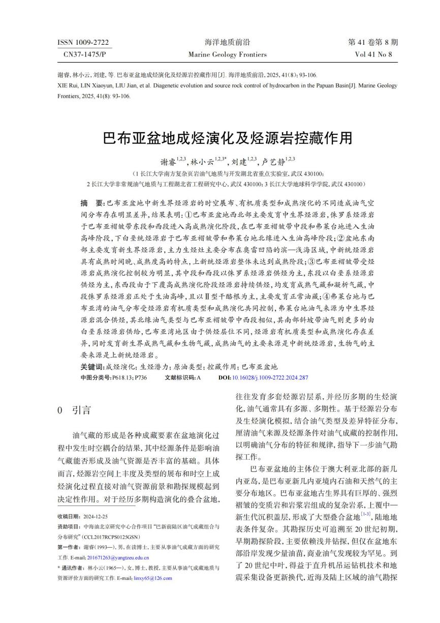 近日,beats365官方网站博士研究生谢睿在核心期刊《海洋地质前沿》上发表题为《巴布亚盆地成烃演化及烃源岩控藏作用》的论文(共13页),全部作者均来自beats365官方网站师生,研究生谢睿为论文第一作者,其导师林小云教授为通信作者。论文重点讨论了巴布亚盆地的烃源岩发育特征、热演化特征及其对油气分布的控制作用。