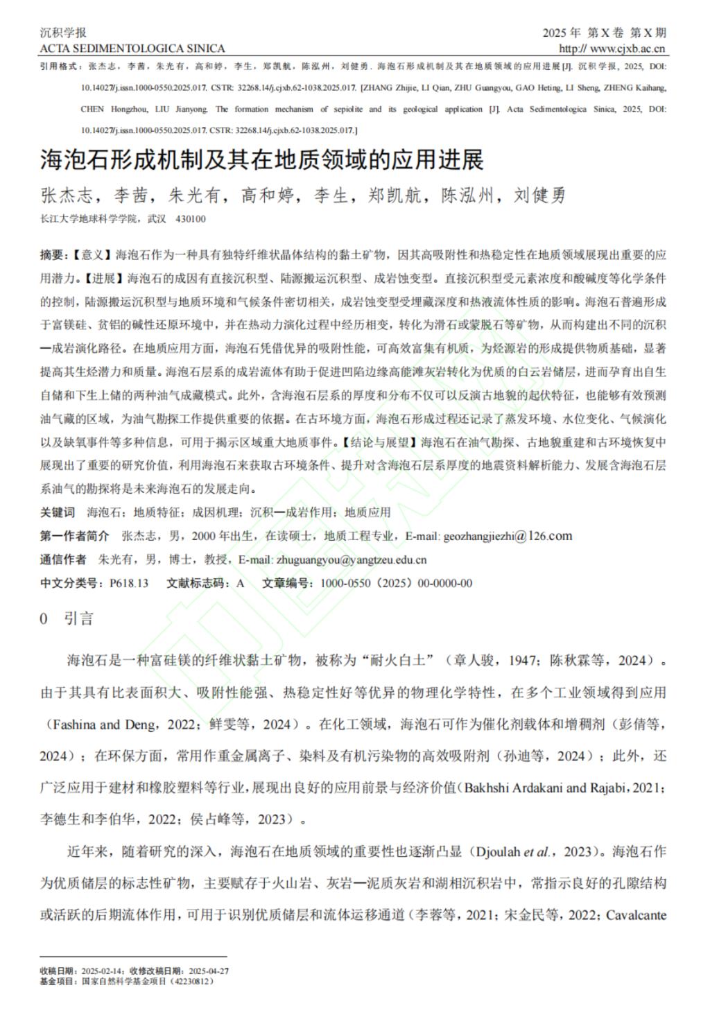 近日,beats365官方网站24级研究生张杰志在核心期刊《沉积学报》上发表了题为《海泡石形成机制及其在地质领域的应用进展》的论文(共32页)。全部作者均来自beats365官方网站师生,研究生张杰志为论文第一作者,其导师朱光有教授为通信作者。论文重点讨论了海泡石的地质特征、成因机制、沉积—成岩的关系以及在地质领域的应用。