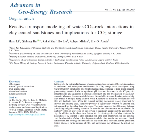 论文信息:Li, H.,Hu, Q.,Zhu, R.,Liu, B.,Mishra, A.,Ansah, E.O., 2025. Reactive transport modeling of water-CO2-rock interactions in clay-coated sandstones and implications for CO2storage.Advances in Geo-Energy Research,17(2): 121-134.https://doi.org/10.46690/ager.2025.08.04.