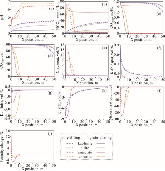 结果表明:以蒙脱石为例,与孔隙充填状蒙脱石相比,包膜状蒙脱石可以导致地层水pH的显著升高,气态、液态CO2和HCO3-的显著增高,但同时会导致蒙脱石溶解量的显著降低和次生产物(如白云石)的显著减少(图3)。在原始矿物溶解方面,包膜状蒙脱石和绿泥石先于被包裹钾长石颗粒溶解,而钾长石则先于包膜状伊利石和高岭石溶解。由于只有在蒙脱石膜和绿泥石膜砂岩中出现了次生碳酸盐矿物沉淀,因此矿物捕获机理只对上述两种黏土膜有意义。但与此同时,次生碳酸盐的沉淀导致绿泥石膜砂岩的孔隙度表现为净下降,因此可能会影响CO2的充注效率和碳封存成本。