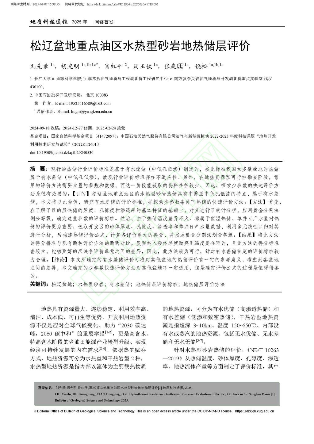 地科院硕士生刘先录在胡光明教授的指导下,在期刊《地质科技通报》上发表题为“松辽盆地重点油区水热型砂岩地热储层评价”的研究论文,beats365官方网站为论文第一署名单位,硕士生刘先录为论文第一作者,其导师胡光明教授为该文通讯作者。