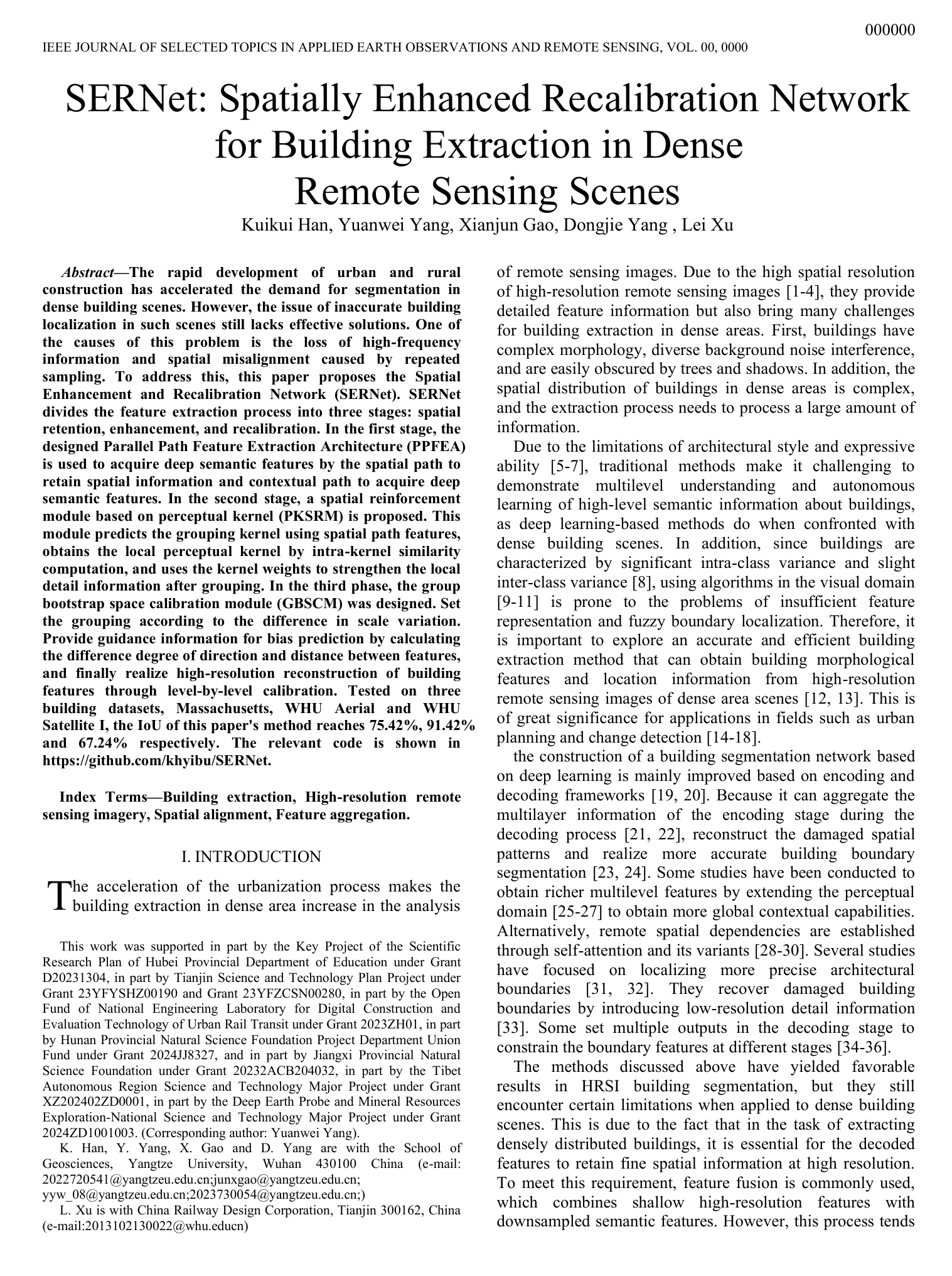 beats365官方网站研究生韩奎奎以第一作者身份在SCI二区期刊《IEEE Journal of Selected Topics in Applied Earth Observations and Remote Sensing》上发表题为“SERNet: Spatially Enhanced Recalibration Network for Building Extraction in Dense Remote Sensing Scenes”的研究论文,其中beats365官方网站为论文第一署名单位,研究生韩奎奎为第一作者,副教授杨元维为论文通讯作者。