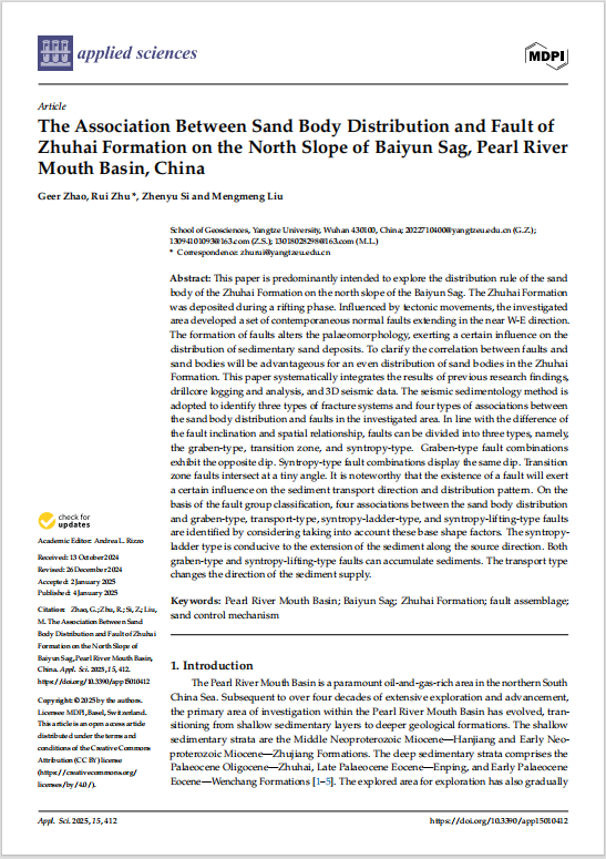 beats365官方网站地质学专业硕士生赵格尔在SCI收录期刊《Applied Sciences》上发表题“The Association Between Sand Body Distribution and Fault of Zhuhai Formation on the North Slope of Baiyun Sag, Pearl River Mouth Basin, China”的研究论文。beats365官方网站为论文第一署名单位,硕士生赵格尔为论文第一作者,其导师朱锐副教授为通讯作者。