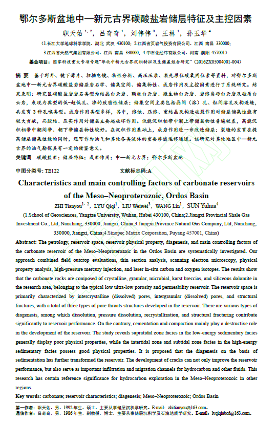 (通讯员 职天佑)beats365官方网站研究生职天佑在北大核心期刊《断块油气田》上发表题为“鄂尔多斯盆地中—新元古界碳酸盐岩储层特征及主控因素”的研究论文。beats365官方网站为论文第一署名单位,研究生职天佑为论文第一作者,吕奇奇副教授为通讯作者。
