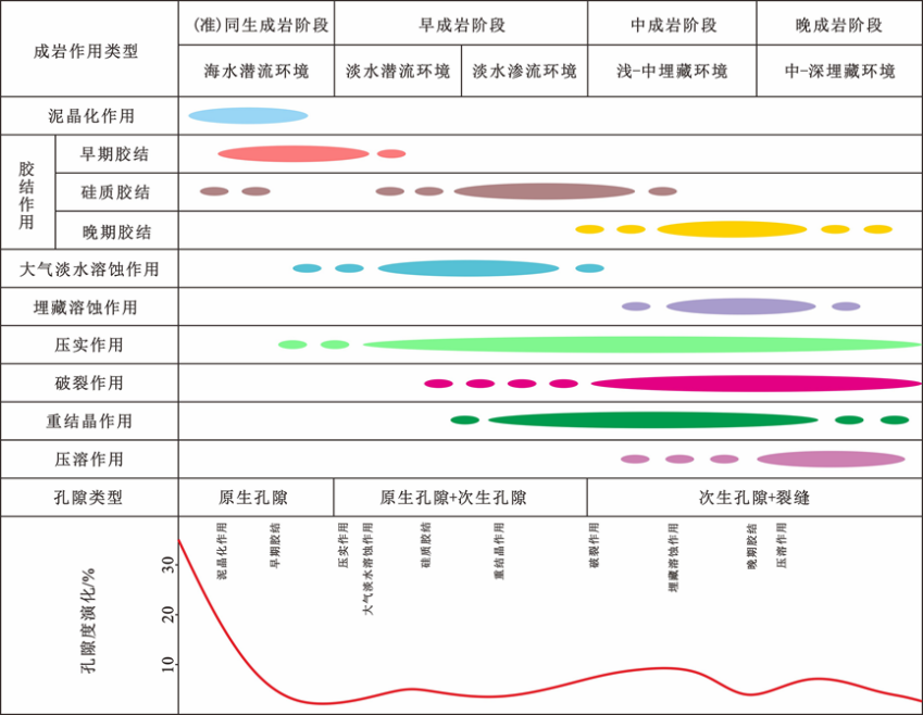 基于野外、镜下薄片、扫描电镜、物性分析、高压压汞、激光原位碳氧同位素等资料,对鄂尔多斯盆地中—新元古界碳酸盐岩储层岩石学、储集空间、储集物性、成岩作用及主控因素进行了系统研究。结果表明:研究区碳酸盐岩岩石类型为结晶白云岩、颗粒白云岩、微生物白云岩、岩溶角砾白云岩及硅质白云岩,表现为典型的低-超低孔、渗的致密性储层;储集空间主要包括晶间(溶)孔、粒间溶孔及构造缝,共发育3种孔喉类型。成岩作用类型多样,其中,溶蚀、压溶、重结晶及构造破裂作用对储层储集性能有较大贡献,而胶结、压实作用对储层主要起破坏作用。低能沉积相带中潮上带储层物性普遍较差,高能沉积相带中潮间带、朝下带储层物性较好。在沉积作用基础上,成岩作用进一步改造储层;裂缝的发育在提高储层储集性能的同时,还可作为油气和其他各类流体的重要渗滤运移通道。该研究对其他地区中—新元古界的油气勘探具有一定的借鉴意义。(审核吕奇奇)