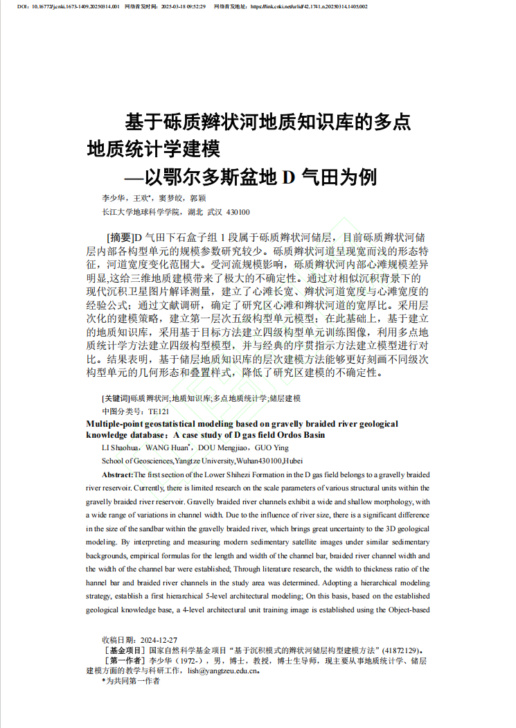 beats365官方网站硕士生王欢在期刊《beats365学报(自然科学版)》上发表了题为“基于砾质辫状河地质知识库的多点地质统计学建模——以鄂尔多斯盆地D气田为例”的研究论文。beats365官方网站为论文第一署名单位,王欢为共同第一作者,其导师李少华教授为该文通讯、第一作者。