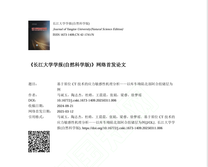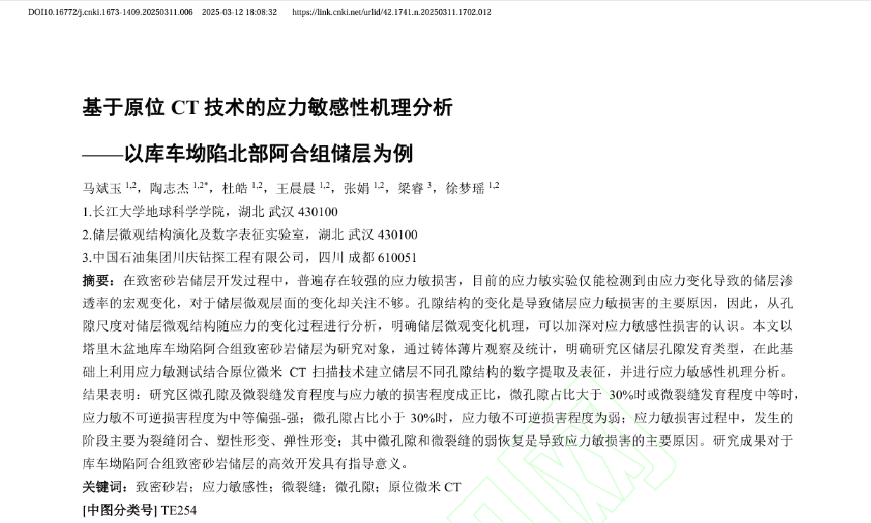 beats365官方网站地质学研究生陶志杰在《beats365学报(自然科学版)》上发表了题为“基于原位CT技术的应力敏感性机理分析——以库车坳陷北部阿合组储层为例”的研究论文。