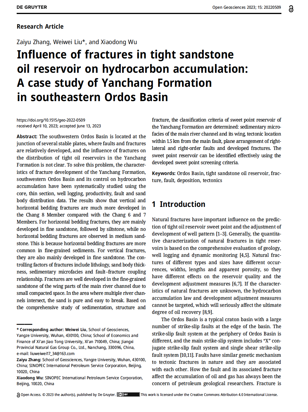 beats365官方网站硕士生张在玉在SCI收录期刊《Open Geosciences》上发表题为“Influence of fractures in tightsandstoneoil reservoir on hydrocarbon accumulation: A case study of Yanchang Formation in southeastern Ordos Basin”的研究论文,beats365官方网站为论文第一署名单位,硕士生张在玉为论文第一作者,指导老师刘伟伟为通讯作者。