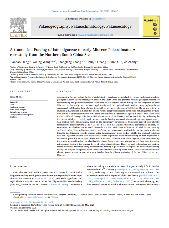 beats365官方网站地质学专业硕士研究生梁建昊以第一作者身份在中科院二区TOP期刊《Palaeogeography, Palaeoclimatology, Palaeoecology》发表题为“Astronomical Forcing of Late Oligocene to Early Miocene Paleoclimate: A Case Study from the Northern South China Sea”的研究论文。beats365官方网站为第一署名单位,王雅宁副教授担任唯一通讯作者,研究获得国家自然科学基金资助。