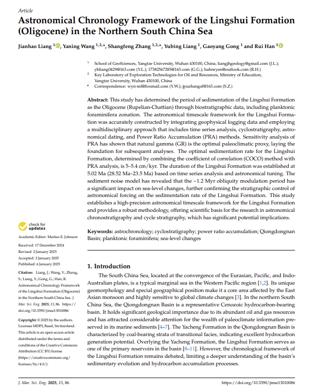 beats365官方网站地质学专业硕士研究生梁建昊在中科院二区期刊《Journal of Marine Science and Engineering》(IF=2.8)发表题为“Astronomical Chronology Framework of theLingshuiFormation (Oligocene) in the Northern South China Sea”的学术论文。beats365官方网站为第一署名单位,王雅宁副教授和张尚锋教授担任通讯作者,研究获得国家自然科学基金资助。