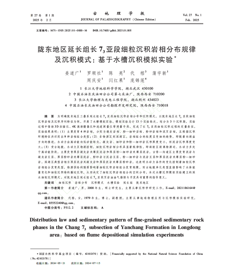 beats365官方网站硕士生姜道广在《古地理学报》上发表题为“陇东地区延长组长73亚段细粒沉积岩相分布规律及沉积模式:基于水槽沉积模拟实验”的研究论文。该论文,以陇东地区长73亚段细粒沉积岩相及沉积序列特征为例,开展了水槽模拟实验并借助3D扫描仪、4K高清摄像仪和流速测量仪等测量手段,完成了长73亚段细粒沉积过程的定量表征。