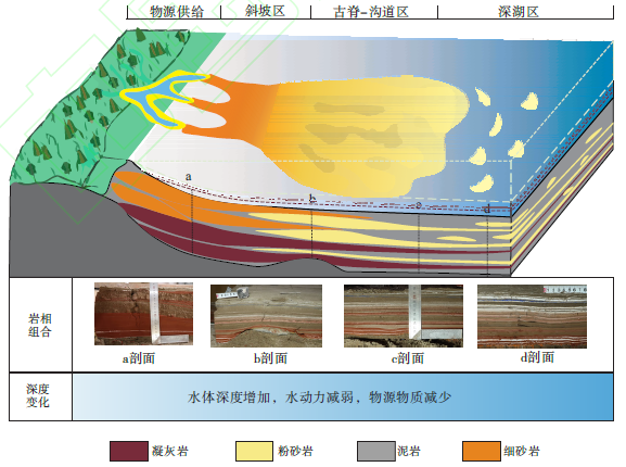 实验表明:(1)主要发育4种岩相,分别为凝灰岩相、粉—细砂岩相、粉砂岩相和泥页岩相,且根据沉积环境特征共识别出9种岩相组合类型;(2)自物源区到深湖区,岩相组合的粒度呈变细的趋势,即随着向湖盆方向的推进,水动力由高动能向低动能转化,凝灰岩、细砂岩和粉—细砂岩沉积厚度变小,而泥岩沉积厚度变大;(3)受古地貌、水动力及物源控制,细粒沉积岩相分布具显著规律性,即斜坡区距离物源近、水动力多处于高动能阶段,主要发育厚层凝灰岩夹薄层泥岩和厚层粉—细砂岩夹薄层泥岩,古脊—沟道区主要发育泥岩与凝灰岩互层、厚层粉砂岩夹薄层泥岩、粉砂岩与泥岩互层、粉—细砂岩与泥岩互层和厚层泥岩夹薄层粉—细砂岩,深湖区典型岩相为厚层泥岩夹凝灰岩和厚层泥岩夹薄层粉砂岩,这表明水动力条件的变化控制着细粒沉积岩相组合发育类型,物源供给的强弱影响着细粒沉积岩相组合发育规模,而古地貌单元类型直接影响了水体能量变化和细粒沉积物的搬运沉积,从而决定了细粒沉积岩相组合的空间分布。