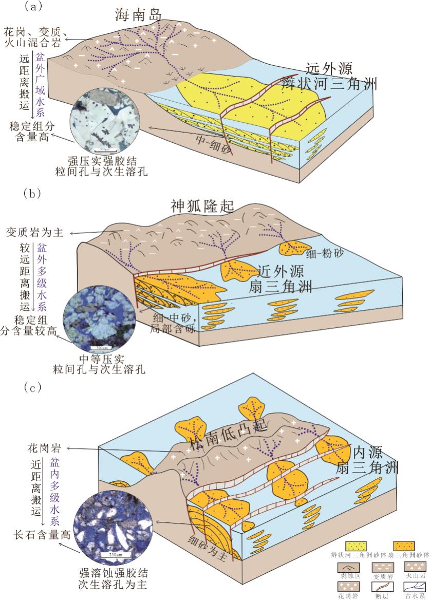 文章认为宝岛-长昌凹陷陵水组储层发育受源汇系统要素和成岩作用的共同影响,其中物源、搬运路径、构造古地貌等源汇要素影响沉积体的组成、分布与规模,成岩作用对储层有直接控制作用。外源型源汇系统储层砂岩中稳定组分含量高,有利于一定的抗压实作用;内源型源汇系统砂岩组分中长石含量高,溶蚀作用十分发育。