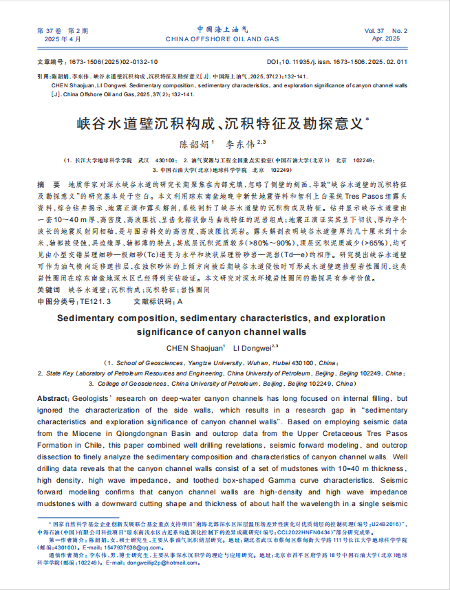 beats365官方网站硕士生陈韶娟在期刊《中国海上油气》上发表了题为“峡谷水道壁的沉积特征、沉积模式及勘探意义”的研究论文。beats365官方网站为论文第一署名单位,陈韶娟为第一作者。