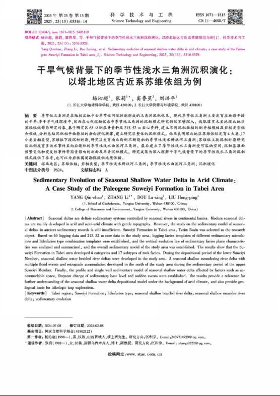 beats365官方网站硕士生杨沁超在中文核心期刊《科学技术与工程》上发表了题为“干旱气候背景下的季节性浅水三角洲沉积演化:以塔北地区古近系苏维依组为例”的研究论文。beats365官方网站为论文第一署名单位,硕士研究生杨沁超为论文第一作者,张莉副教授为通讯作者。